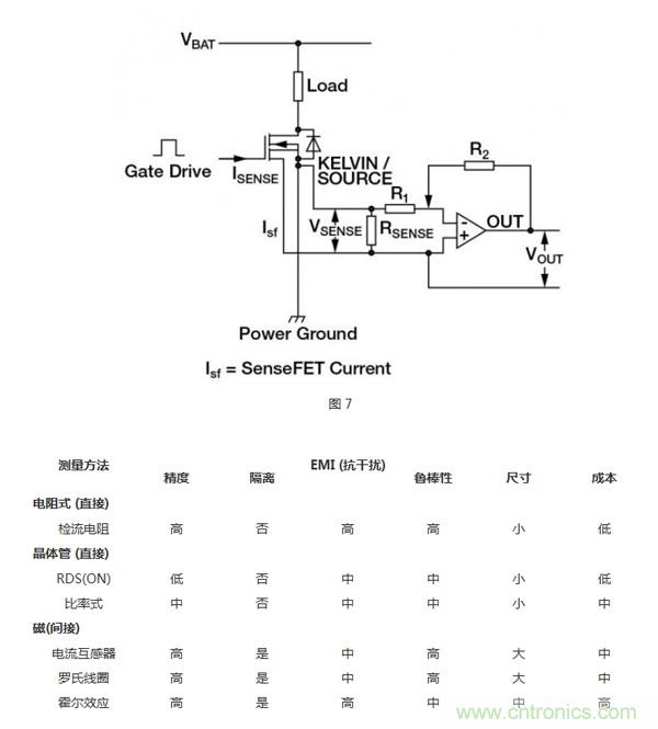 MOSFET由成千上萬(wàn)個(gè)能降低導(dǎo)通電阻的并聯(lián)的晶體管元胞構(gòu)成。檢流MOSFET使用一少部分并聯(lián)元胞,連到共柵極和漏極,但源極是分開的(圖7)。這樣就產(chǎn)生了第2個(gè)隔離的晶體管,即“檢測(cè)”晶體管。當(dāng)晶體管導(dǎo)通時(shí),流經(jīng)檢測(cè)晶體管的電流與流經(jīng)其他元胞的主電流成一定比例。