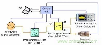 在圖1中,微波信號發(fā)生器所產(chǎn)生的信號經(jīng)過一個可編程的帶通濾波器到達(dá)一個SPDT微波開關(guān)的輸入端(RF1),開關(guān)的二個輸出端J1和J2分別接需要被校準(zhǔn)的頻譜分析儀和標(biāo)準(zhǔn)功率計。在校準(zhǔn)測試過程中,功率計讀一次來自信號源的幅度后,開關(guān)即刻切換到頻譜分析儀,并記錄頻譜分析儀針對信號源幅度的讀數(shù)。