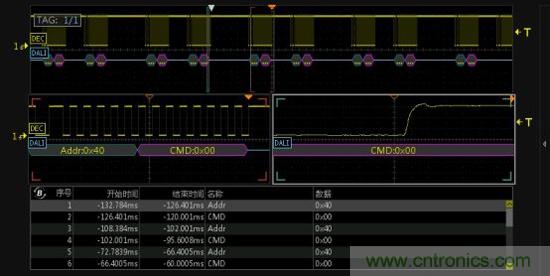 對(duì)長時(shí)間監(jiān)測的數(shù)據(jù)進(jìn)行異常分析,可在示波器的縮放模式下使用雙ZOOM多窗口顯示的功能,對(duì)信號(hào)進(jìn)行多窗口異常監(jiān)測和分析,可同時(shí)對(duì)任一數(shù)據(jù)幀和數(shù)椐幀上升沿或下降沿細(xì)節(jié)進(jìn)行分析,然后通過查看放大數(shù)椐細(xì)節(jié),事件表中的數(shù)據(jù)和波形一一對(duì)應(yīng),定位異常非常方便,如下圖7所示。