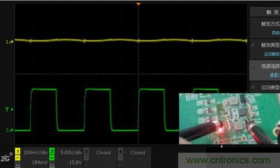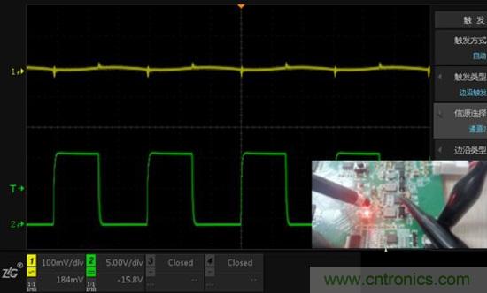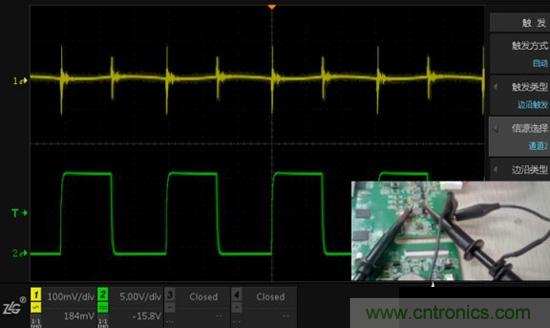 圖2.CH1使用夾子測(cè)量電源輸出,CH2懸空