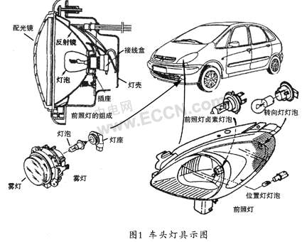 汽車車前燈具如圖1所示。其中的前照燈像人的眼睛一樣,起到畫龍點(diǎn)睛的作用,為汽車增色不少,如圖2所示。