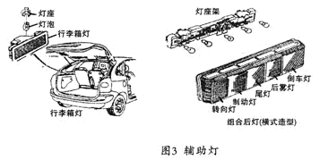 在車用燈具中,通常人們還將后轉(zhuǎn)向燈、制動(dòng)燈、尾燈、后霧燈、倒車燈和行李箱燈等稱為輔助燈具,如圖3所示。