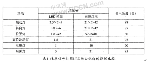 (2)非常節(jié)能,比同等亮度的白熾燈節(jié)能至少在一半以上。表1列示了汽車信號(hào)燈與白熾燈能耗的比較。