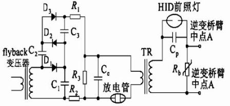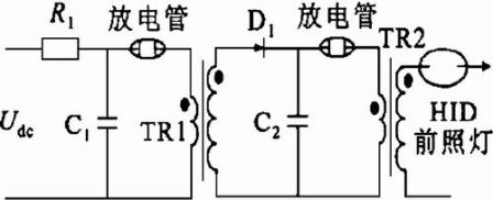 啟動期間,電子鎮(zhèn)流器要經歷高壓擊穿、電流接續(xù)、預熱維弧3個階段。高壓啟動電路是HID 前照燈能否瞬間點亮的基礎。但輝光放電后慣性和濾波延遲使直流變換器和檢測回路很難有較快的響應速度,所以需要如圖1所示的電流接續(xù)(take-over) 電路,它可利用電容預先儲存的能量為燈提供一個較大的瞬間電流(約300ms) ,保證輝弧可靠過渡。一般高壓發(fā)生電路有以下幾種: