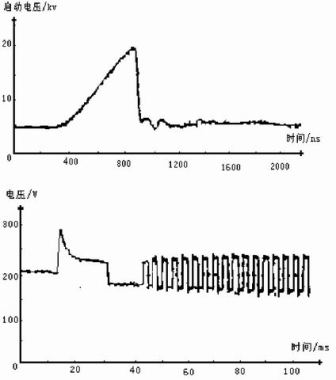 圖5采用3倍壓整流電路,放電管的額定擊穿電壓為600V ,高壓包的匝數比1∶50 ,放電管擊穿電壓為600V。實驗波形見圖6。