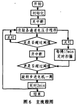 本系統(tǒng)以單片機AT89S52為核心,采用光照檢測、聲控以及步進電機旋轉(zhuǎn)熱釋電紅外等傳感器進行環(huán)境探測。系統(tǒng)首先啟動可見光模塊,通過光一流一壓轉(zhuǎn)換后,經(jīng)過A/D轉(zhuǎn)化為數(shù)字量并通過液晶顯示。若是電壓較小,說明了亮度不夠,則繼續(xù)檢測聲音。若是聲音較大,則在短時間內(nèi)調(diào)用步進電機模塊,檢測是否有人;否則,每隔15 min定時檢測。因為在實際過程中,設(shè)置聲光的閾值都缺乏直觀性,所以使用液晶電壓顯示進行判斷。光、聲的閾值可以根據(jù)不同地方的實際情況通過軟件進行調(diào)整。