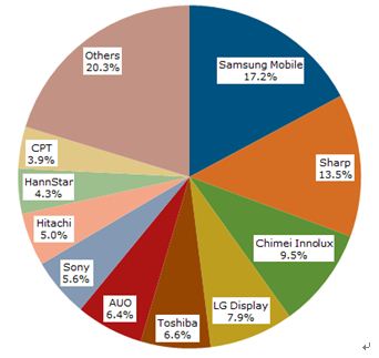 一如預(yù)期,三星移動(dòng)顯示器(SMD)再次維持其領(lǐng)先的地位,在2011年市占率達(dá)到17.2%,主要來(lái)自于AMOLED在智能手機(jī)市場(chǎng)應(yīng)用的提高。緊隨其后的是夏普和奇美, 2011年市占率分別為13.5%和9.5%。