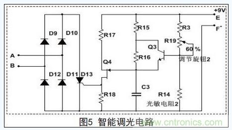 當(dāng)LED照明設(shè)備開始工作后,本文設(shè)計(jì)的智能開關(guān)會(huì)依據(jù)環(huán)境照明情況的變化,通過智能調(diào)光電路自動(dòng)地改變照明設(shè)備的亮度。圖1所示的智能調(diào)光電路接口A、B接入的電路如圖5所示。