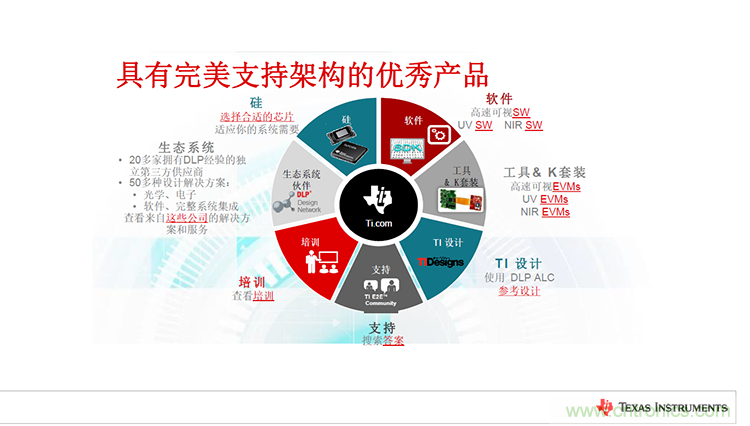 “為加速滲透民用主流市場,TI不僅推出了性能優(yōu)異的產(chǎn)品,還建立了一流的支持架構(gòu),以借助廣大TI用戶加快產(chǎn)品面市。”Ane Sacks女士還表示,“針對TI的IC和DLP芯片組,TI可以提供軟件、工具套件、參考設(shè)計、工程社區(qū)交流、技術(shù)培訓(xùn)以及完善的DLP生態(tài)系統(tǒng)等技術(shù)支持,包含20多家擁有DLP經(jīng)驗(yàn)的獨(dú)立第三方供應(yīng)商以及50多種光學(xué)、電子、軟件等方面的設(shè)計解決方案,能夠?qū)⒆钚碌膭?chuàng)新、產(chǎn)品和應(yīng)用及時、快速地傳遞給客戶。”