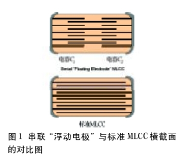 許多年前,人們發(fā)現(xiàn)在空氣中測(cè)試500VDC以上的電壓時(shí),MLCC標(biāo)準(zhǔn)設(shè)計(jì)的性能出現(xiàn)了問題。有效層(active layer)之間的內(nèi)部擊穿和接線端之間的表面弧導(dǎo)致了故障的出現(xiàn)。為了解決電容器的有效區(qū)(active area)的電壓應(yīng)力問題,制造商開發(fā)出了一種串聯(lián)“浮動(dòng)電極”設(shè)計(jì),在單個(gè)元件內(nèi)有效集成了2個(gè)以上的電容器組。圖1是這類設(shè)計(jì)與標(biāo)準(zhǔn)MLCC的比較。