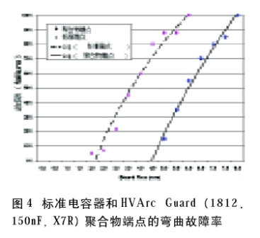 如同在前一部分中提到的那樣,焊接引線和涂層已廣泛用于生產(chǎn)高壓元件。除了引線外,引線框也可以用來封裝多個(gè)電容器,以得到更高的容量和增加符合性。盡管增加一個(gè)鷗翼型引線框會(huì)顯著增加元件的成本,但是它可以避免電路板彎曲的發(fā)生。直到最近,都沒有有效的方法來增加表面貼裝器件端點(diǎn)的符合性,但這個(gè)歷史已經(jīng)一去不復(fù)返了。通過在環(huán)氧聚合物端點(diǎn)上加上銀,可以防止電路板彎曲時(shí)發(fā)生的故障,進(jìn)而增加可靠性。這種選擇目前已用于我們的OMD-Cap范圍高壓系列設(shè)計(jì)以及HVArc Guard電容器。當(dāng)電路板彎曲時(shí),標(biāo)準(zhǔn)電容器與相同HVArc Guard電容器的聚合物端點(diǎn)的測(cè)試顯示的故障率差異如圖4所示。