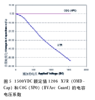 高壓電容器通常是采用X 7 R 和C0G 電解質(zhì)制造的。這些名稱描述了在-55~+125℃溫度系數(shù)將分別為美國(guó)電子工業(yè)協(xié)會(huì)(EIA)的±15%和±30×10-6/℃。C0G電容器也可以用更常用的術(shù)語(yǔ)表示,即NP0(正負(fù)零)。不過,值得注意的是,在1kHz條件下以1Vrms進(jìn)行電容測(cè)量非常重要,各種材料可以用這些名稱來描述。對(duì)許多電源應(yīng)用來說,重要的是知道在某個(gè)具體電壓下的電容容量。X7R和C0G(NP0)電容器之間存在顯著的差異;施加了DC電壓的X7R電容器將釋放出大量容量,而C0G(NP0)電容仍然沒有太大的變化。出現(xiàn)這種現(xiàn)象是由于與C0G(NP0)電解質(zhì)的鐵電性質(zhì)相比,鐵電X 7 R 材料在剩余極化(remnant polarization)方面有根本的不同。實(shí)際上,雖然X7R MLCC具有高得多的容量,但是其容量在施加DC電壓時(shí)會(huì)顯著下降。這方面的一個(gè)例子如圖5所示。因此,當(dāng)采用多層電容器時(shí),設(shè)計(jì)人員必須考慮到施加電壓下的可用容量。