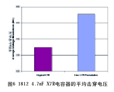 如前面敘述的那樣,有許多材料可以滿足X7R或C0G(NP0)的這類TCC要求。這些材料與各種設(shè)計(jì)的組合并不能在施加的DC電壓下以完全相同的方式實(shí)現(xiàn)。不同制造商任何給定電壓的可用容量一定會(huì)有很大的差異。較高的電壓可以與X 7 R 電解質(zhì)中的鐵電疇(ferroelectric domain)相耦合,在元件上產(chǎn)生一種機(jī)械應(yīng)力。這種“壓電應(yīng)力”會(huì)導(dǎo)致電容器在z方向上若干微米的移動(dòng)。當(dāng)然,這是根據(jù)壓電執(zhí)行器的原理,但是在MLCC的情況下,連續(xù)的電壓尖峰會(huì)導(dǎo)致應(yīng)力裂紋和故障。為了解決這個(gè)問題,應(yīng)該使用這種具有降低壓電耦合能力的2000VDC 以上額定值的X7R電解質(zhì)電容器。降低耦合系數(shù)的影響可以增加擊穿耐壓,如圖6所示。這些設(shè)計(jì)采用了完全相同的有效厚度和“浮動(dòng)電極”型設(shè)計(jì)。唯一的差異在于X7R電解質(zhì)的新制劑方面的修改,它可以減少與施加電壓的耦合。這種新制劑已用于我們的高壓OMD-Cap產(chǎn)品線。