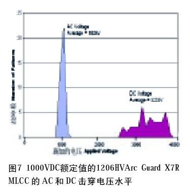 在許多應(yīng)用中,AC電源處理以及承受AC電壓的能力至關(guān)重要。測(cè)量這種能力的一種典型方法是在各種高頻條件下施加AC紋波電壓,直到電容器增加到超過環(huán)境溫度20℃以上。不過,在X7R電容器與C0G(NP0)的電容器之間又一次出現(xiàn)了顯著的差異,前者的剩余電偶(remnant dipole)隨著施加的電場(chǎng)移動(dòng)而引起發(fā)熱,而后者在這種情況下的溫度不會(huì)增加。另一個(gè)AC 能力指標(biāo)是通過施加60Hz AC電壓,將其提升至6kV峰值30s 以上,直到發(fā)生電解質(zhì)擊穿而實(shí)現(xiàn)的。這種類型測(cè)試的結(jié)果可以與對(duì)1000VDC額定值的1206 X7R HVArc Guard電容器施加500Vdc/s的破壞測(cè)試的DC擊穿電壓相比,如圖7所示。D C 電壓故障的發(fā)生遠(yuǎn)遠(yuǎn)超過了1000VDC額定值。由于AC電壓故障發(fā)生在1000VAC左右,與DC電壓相比,故障的分布范圍很窄。