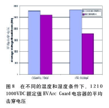 如前面提到的那樣,電容器或電路板涂層可以防止表面弧,而且還可以作為一種防潮的屏障。為了測(cè)試HVArc Guard元件對(duì)由濕度引起的故障的易感性,對(duì)1210外殼尺寸、1000VDC額定值的MLCC樣品進(jìn)行了擊穿電壓測(cè)試,其環(huán)境條件為23.8℃/53.3%RH,提高的溫濕度為85℃/85%RH。其結(jié)果如圖8所示。盡管在85/85條件下X7R的平均擊穿電壓相當(dāng)?shù)?,但C0G(NP0)幾乎不受影響。因此,C0G(NP0)看似不那么易受潮濕所引起故障的影響,而兩種情況的擊穿都是在容許范圍以內(nèi),即使是在高濕度條件下。兩種環(huán)境條件下測(cè)試的元件擊穿范圍均高于額定電壓。
