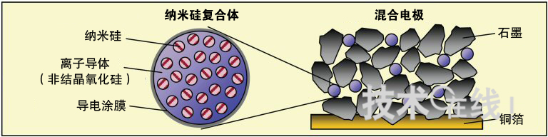 該公司的硅類負(fù)極材料的特點(diǎn)是,含有將粒徑僅為nm大小的硅分散于非結(jié)晶SiO(氧化硅)內(nèi)的“納米硅復(fù)合體”(圖1)。而非結(jié)晶SiO可緩和硅的膨脹及縮小程度。實(shí)際上是利用碳覆蓋SiO的粒子表面,以提高導(dǎo)電性,然后與原來的負(fù)極材料——石墨混合起來利用。