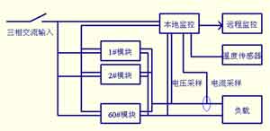 大功率電動汽車充電機(jī)的輸入為額定線電壓380V、50Hz的三相交流電,輸出額定電壓700V,額定電流600A。系統(tǒng)采用19"標(biāo)準(zhǔn)機(jī)架,結(jié)構(gòu)緊湊、布局合理、外型美觀大方。外型尺寸:高×寬×深為2200mm×600mm×600mm。采用60個模塊并聯(lián),每個模塊10A/700V,模塊尺寸:高×寬×深為133mm×425mm×270mm,15層4列,分四個柜體安放,四個柜體可分開運(yùn)輸,使用時緊湊左右排列。機(jī)架前門、后門均為雙開門,方便檢修。電源進(jìn)線和匯流排輸出位置均在底部輸入。電源輸入斷路器及監(jiān)控單元觸摸屏安裝在主機(jī)中間控制柜前部。充電機(jī)控制結(jié)構(gòu)示意圖如圖2所示。