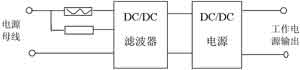 電源控制器中控制模塊使用的工作電源取自一次電源母線,工作電源有兩個模塊并聯(lián)組成。當(dāng)其中一個工作電源模塊發(fā)生故障時,即自動退出供電回路,由另一個工作電源模塊完成供電,保證控制電路的用電,電路故障則通過隔離二極管來隔離。