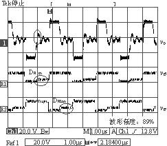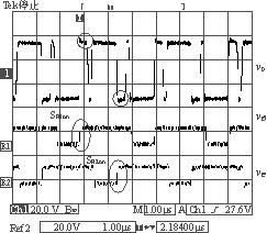 IM-CDR結(jié)構(gòu)選擇如圖1(c)所示的拓?fù)洹慕Y(jié)構(gòu)上可以看出,磁芯的3個(gè)磁柱上都加了相同的氣隙(lg),這必然會(huì)導(dǎo)致變壓器原邊的漏感(Lk)的增大,但可以利用變壓器原邊漏感中的能量實(shí)現(xiàn)副邊同步整流管的自驅(qū)動(dòng)(開通),同步管的關(guān)斷是通過外加驅(qū)動(dòng)信號(hào)來完成的。實(shí)驗(yàn)電路如圖2所示,由圖2可以看到副邊同步管的驅(qū)動(dòng)電路包括一個(gè)繞組(Na),兩個(gè)二極管(Da1,Da2)和兩個(gè)MOS管(Sa1,Sa2),它的實(shí)現(xiàn)比較簡單,只需要在磁芯的中心磁柱上多加一組繞組即可。變壓器原邊采用的是對稱半橋拓?fù)?。?shí)驗(yàn)電路的具體參數(shù)見表1所列。實(shí)驗(yàn)波形圖如圖3和圖4所示。圖3是在負(fù)載電流Io=4A時(shí)測得的變壓器原邊電壓波形以及兩個(gè)同步整流管的門極驅(qū)動(dòng)電壓波形圖。由于此時(shí)的負(fù)載電流較小,反映到變壓器原邊的激磁電流也較小,在原邊開關(guān)管關(guān)斷的瞬間,變壓器原邊漏感(Lk)與開關(guān)管輸出結(jié)電容(Co1,Co2)間的振蕩尖峰不夠高,不足以開通副邊的同步整流管。