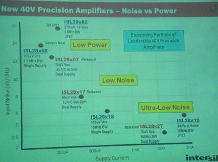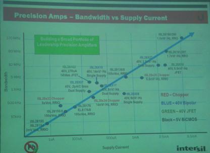 Intersil建立一個以精準放大器為主的大系列產品,從最初的ISL28194到ISL28190/290產品,頻帶寬度和電流都有很大提升。