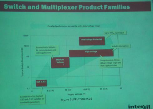 Roger還介紹了Intersil開關和多路復用器及接口產品線的情況,其sub 0.5Ω開關用于便攜應用,中壓產品用于通信和視頻應用,并且能提供高壓單/雙電源開關等。