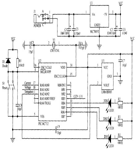 目前,電動車電池作為一種儲能裝置,主要以鉛酸蓄電池為主,充電器是專門針對鉛酸蓄電池所設(shè)計的。傳統(tǒng)的蓄電池充電器采用電流/電壓負反饋的方法來達到恒流/恒壓充電的目的,為了實現(xiàn)充電過程各種工作參量的實時監(jiān)測及智能多段式充電策略的精確控制,引入電流/電壓反饋環(huán),應(yīng)用P IC16C712 單片機及相應(yīng)的控制電路,其硬件結(jié)構(gòu)框圖如圖1所示,電路圖如圖2所示。