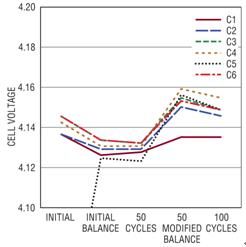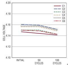 電池組 1 經(jīng)過(guò)了 100 個(gè)充電 / 放電周期,圖 3 顯示若干周期后記錄 6 節(jié)電池的電壓。該圖顯示,經(jīng)過(guò)短暫停頓后,在一個(gè)完整的充電周期結(jié)束時(shí)所測(cè)得的電池電壓。充電后,電池電壓之間的不平衡與容量和內(nèi)部電阻的小量變化有關(guān)。在第一個(gè)完整的周期中,測(cè)得的電池組容量為 2.072AHr,經(jīng)過(guò) 100 個(gè)周期后,所測(cè)得的容量為 2.043AHr,隨著周期數(shù)增加,容量有少量下降。還有一種趨勢(shì),即隨著充電 / 放電周期數(shù)的增加,充電后電池的最終電壓下降了,100 個(gè)周期以后,這種趨勢(shì)尤其顯著。這種趨勢(shì)最有可能是因?yàn)殡姵乩匣痣姵貎?nèi)部電阻的小量增加導(dǎo)致的。內(nèi)部電阻增加使電池更快地達(dá)到充電結(jié)束門(mén)限。盡管在工作時(shí)沒(méi)有平衡,這個(gè)電池組在 100 個(gè)周期中自始至終保持著同樣程度的不平衡。能像這個(gè)電池組一樣,每節(jié)電池自然而然相互匹配的電池組相當(dāng)罕見(jiàn)。