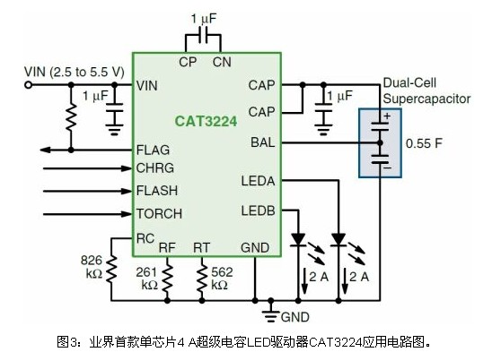 CAT3224則是業(yè)界首款4 A單芯片超級電容LED驅(qū)動器(見圖3),集成了雙模1x/2x電荷泵,提供三項關鍵功能:精密的超級電容充電控制、電流放電至LED閃光的管理,以及為LED手電筒模式提供恒流。這三種模式的工作電流能以3顆外部電阻作簡易編程,能吸收達4 A的LED閃光脈沖電流。超級電容技術的高峰值電流優(yōu)勢,結(jié)合CAT3224簡單的并行邏輯接口,使這器件成為采用LED替代氙氣燈的應用的極佳選擇。