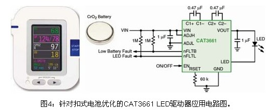 如今,越來越多的創(chuàng)新型便攜設備采用扣式電池(coin cell)供電,如醫(yī)療應用中的血糖儀、數(shù)字體溫計、血氧計、呼吸分析儀和生理監(jiān)測儀等。由于這種電池的獨特特性以及需要長工作壽命,這些緊湊型應用需要定制的LED驅(qū)動器,不僅要管理背光,還要監(jiān)測電池電量。在這類應用中,可以采用安森美半導體計劃于2010年下半年推出的CAT3661 2至2.5 V單LED驅(qū)動器。這器件同樣采用安森美半導體專利的四模(Quad Mode)電荷泵架構,能效高達92%,靜態(tài)電流低至約150 μA,提供可調(diào)節(jié)的低電池電量檢測功能,以及強固的LED故障監(jiān)測、軟啟動和短路限制等保護功能,采用低高度的3 x 3 mm TQFN-16封裝,非常適合這些便攜設備應用。