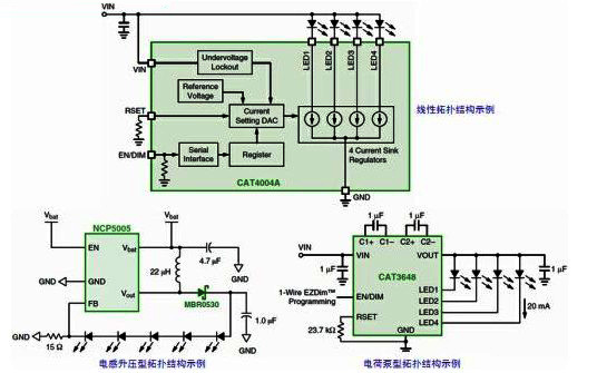圖1: 低壓便攜設備應用的不同LED驅(qū)動器拓撲結(jié)構示例