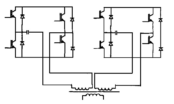 當負載電容容量小且重復頻率高時, 一種設計思想是改進控制電路, 使其達到的效果相當于: 在每一個充電周期開始階段, 使用諧振電流大的主電源快速充電至預設電壓, 隨后轉(zhuǎn)為小電流電源充電, 在T w 階段向負載提供很小的電量以減小波動; 另一種技術(shù)路線采用雙橋路的移相控制電路, 如圖7 所示,這種電路非常適合大功率充電的應用場合。EM I 公司的30kJ/s , 50kV 電源采用了此項技術(shù)。