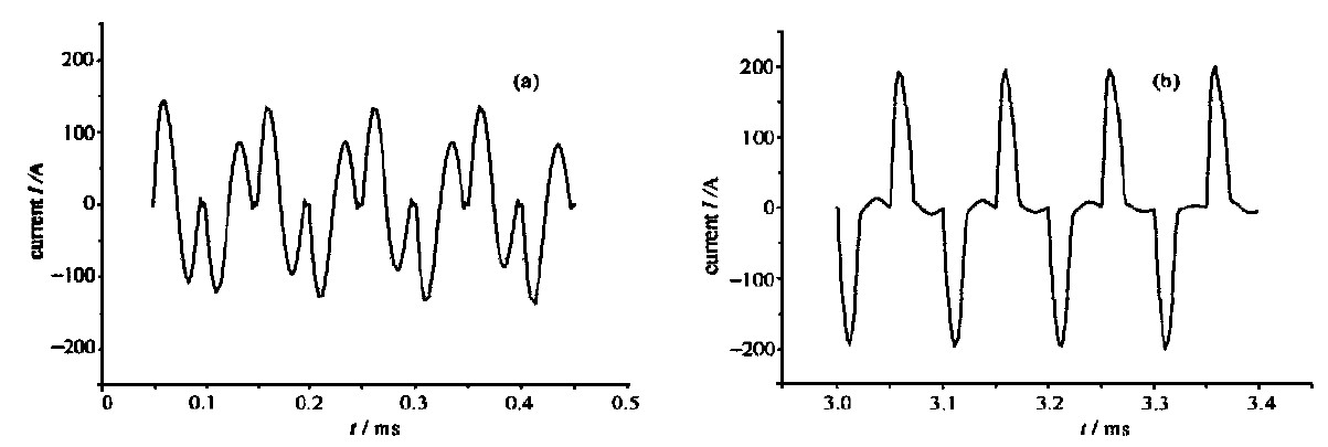 圖6 是某調(diào)制器充電電源波形圖, 該電源充電功率可達2kJ/s , 工作頻率12. 5kHz, 電壓30kV.測量用的示波器型號為泰克TDS3032.V s= 500V , C r= 0. 4uF,L r= 158uH, T s= 80us, 變壓器副邊為雙繞組,每繞組升壓比1∶40, Cload= 0. 66uF.實際電路中L r 完全利用了變壓器的漏感, 且漏感選擇較大以減小分布電容。圖6 (c) 是該電源諧振開關(guān)電流的仿真波形, 和實測波形比, 吻合得很好。