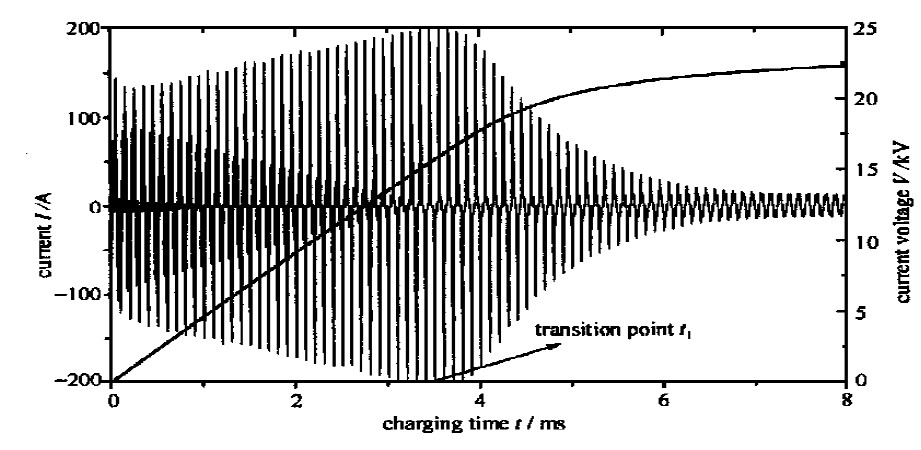 忽略回路電阻, 電路的特征阻抗為Z =√ L/C , 諧振周期為T r = 2π √L/C , 其中C 是諧振電容C r 和折合到原邊的負載等效電容C''串聯(lián)后形成的總電容, 通常因高壓變壓器變比高, 等效電容C ''和C r相比較大, 因此串聯(lián)后的總電容C 和C r 相差不大。完整的充電電流波形包絡及充電電壓如圖4 所示, 其中t1是轉(zhuǎn)折點, t1 以前是線性等臺階充電, t1 以前電流波形放大如圖5 (a) 所示, 轉(zhuǎn)折點附近的電流波形如圖5(b) 所示。