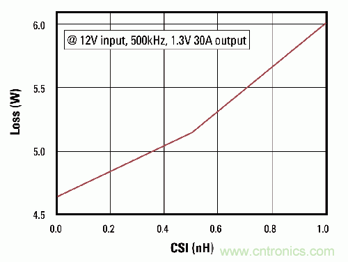圖1為具備雜散電感和電阻(由封裝鍵合線、引線框以及電路板布局和互連線帶來(lái))等寄生效應(yīng)的半橋電路。共源電感(CSI)傾向于降低控制FET(高邊FET)的導(dǎo)通和關(guān)斷速度。如果與柵極驅(qū)動(dòng)串聯(lián),通過(guò)CSI的電壓加至柵極驅(qū)動(dòng)上,可使FET處于導(dǎo)通狀態(tài)(條件:V = -Ldi/dt),從而延遲晶體管的關(guān)斷。這也會(huì)增大控制FET的功耗,如圖2所示。