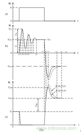 圖6是圖4和圖5電路中,當開關管導通時(圖4),輸入電壓ui通過開關變壓器漏感Ls對分布電容Cs進行充電,使漏感Ls與分布電容Cs產生沖擊振蕩時,分布電容Cs兩端的電壓波形;和當開關管關斷時(圖5),輸入電壓ui與開關變壓器漏感Ls和分布電容Cs、Cds產生充、放電時,電源開關管D、S極兩端的波形。