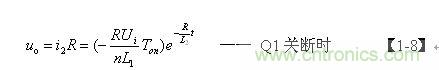 【1-8】式中,L1、L2分別為開關變壓器初、次級線圈的電感,n為開關變壓器線圈的匝數(shù)比,n=N2/N1,Ui為變壓器初級線圈的輸入電壓,Ton為開關管的導通時間,R為等效負載電阻。