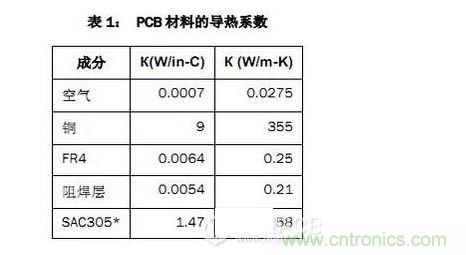 該PCB主要由FR4電路板材料和銅組成,另有少量焊料、鎳和金。表1列出了主要材料的導熱系數(shù)。