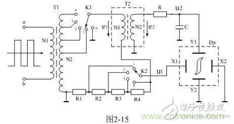 在圖2-15中,開關(guān)K1是用來選擇輸入電壓幅度的,當(dāng)K1選擇“1”的位置時(shí),輸入電壓的幅度比較小,被測(cè)試樣品的磁滯回線面積也比較小;當(dāng)K1選擇“4”的位置時(shí),輸入電壓的幅度比較大,被測(cè)試樣品的磁滯回線面積也比較大。