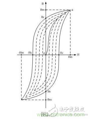 從圖2-16可以看出,當(dāng)變壓器鐵芯中不存在磁化場(chǎng)時(shí),H和B均為零,即圖2-16中B~H曲線的坐標(biāo)原點(diǎn)0。隨著磁場(chǎng)強(qiáng)度H的增加,磁通密度B也隨之增加,但兩者之間不是線性關(guān)系。當(dāng)H增加到一定值時(shí),B不再增加(或增加十分緩慢),這說明該變壓器鐵芯的磁化已接近飽和狀態(tài)。一般人們都把Hm和Bm分別稱為最大磁場(chǎng)強(qiáng)度和最大磁通密度(對(duì)應(yīng)于圖中a點(diǎn));而把Hs和Bs分別稱為飽和磁場(chǎng)強(qiáng)度和磁通密度。