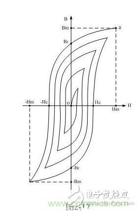 如果再使H逐漸退到零,則與此同時(shí)B也逐漸減少。然而H和B對(duì)應(yīng)的曲線軌跡并不沿原曲線軌跡a-0返回,而是沿另一曲線下降到Br,這說明當(dāng)H下降為零時(shí),鐵磁物質(zhì)中仍保留一定的磁性,這種現(xiàn)象稱為磁滯,Br稱為剩磁。將磁場(chǎng)反向,再逐漸增加其強(qiáng)度,直到H=-Hc,磁通密度消失,這說明要消除剩磁,必須施加反向磁場(chǎng)Hc。Hc稱為矯頑力。它的大小反映鐵磁材料保持剩磁狀態(tài)的能力。圖2-16表明,當(dāng)磁場(chǎng)按Hm→0→-Hc→-Hm→0→Hc→Hm次序變化時(shí),B所經(jīng)歷的相應(yīng)變化為Bm→Br→0→-Bm→-Br→0→Bm。于是得到一條閉合的B~H曲線,稱為磁滯回線。所以,當(dāng)鐵磁材料處于交變磁場(chǎng)中時(shí)(如變壓器中的鐵芯),它將沿磁滯回線反復(fù)被磁化→去磁→反向磁化→反向去磁。在此過程中要消耗額外的能量,并以熱的形式從鐵磁材料中釋放,這種損耗稱為磁滯損耗。前面已經(jīng)證明,磁滯損耗與磁滯回線所圍面積成正比。