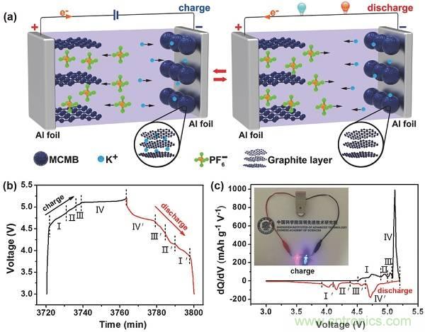近日,中科院深圳先進技術研究院唐永炳研究員(通訊作者)課題組在Adv. Energy Mater.上發(fā)表了一篇名為“A Dual-Carbon Battery Based on Potassium-Ion Electrolyte”的文章。研究人員開發(fā)了基于鉀離子電解液的新型雙碳電池(命名為K-DCB),其中中間相碳微球作為負極材料,膨脹石墨作為正極材料。實驗人員研究了K-DCB的工作機理:充電時,K+運動到石墨負極并嵌入到石墨層間形成插層化合物,同時PF6-運動到正極,插層到中間相碳微球的層間;放電時則相反。結果表明,該K-DCB在3.0~5.2V的電壓窗口范圍,1C的電流密度下可以提供61mAh g-1的可逆比容量,并且具有良好的循環(huán)性能,循環(huán)100次后容量幾乎無衰減。此外,該K-DCB具有較高的放電中值電壓(4.5V),能夠滿足一些高電壓設備的要求。K-DCB具有環(huán)保、成本低、能量密度高等優(yōu)點,對未來能源儲存應用極具潛力。