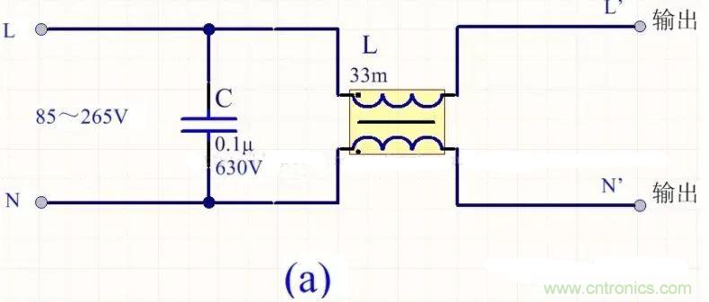 為降低成本和減小體積,開關(guān)電源一般采用簡(jiǎn)易的EMI濾波器,主要包括共模扼流圈L和濾波電容,以下四種可以根據(jù)情況進(jìn)行選擇: