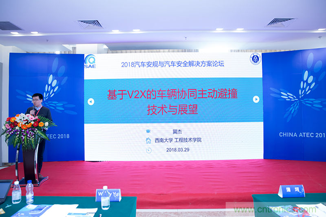 西南大學汽車電子專家冀杰博士在論壇上做了車規(guī)與基于V2X的車輛協(xié)同主動避撞技術展望的大會報告。