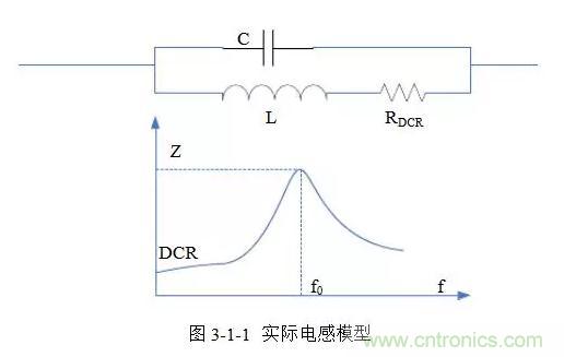 理想模式的電感,其阻抗與頻率呈線性關(guān)系,會隨頻率升高而增大。實(shí)際電感模型如圖3-1-1所示,由電感L串聯(lián)R(DCR)和寄生電容C并聯(lián)而成,存在自激頻率f(o)。頻率小于f(o)時(shí)呈感性,大于f(o)時(shí)呈容性,在f(o)處阻抗最大。