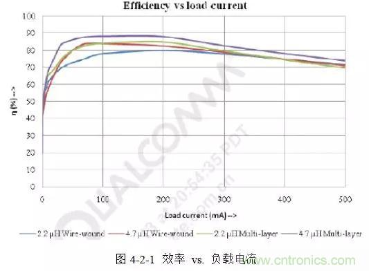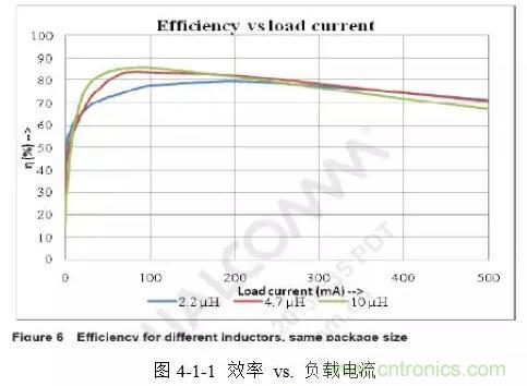 而大容量的電感具有較低的紋波電流和紋波電壓,較低的AC和傳導(dǎo)損失,在輕載時(shí)有較高的效率。圖4-1-1所示是Taiyo Yuden三種 2518封裝不同容量大小的電感負(fù)載電流跟效率的關(guān)系曲線。