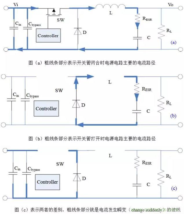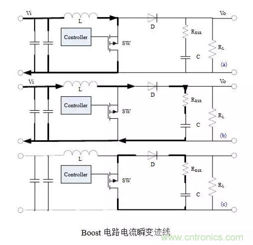 以Buck電路為例,不管開關(guān)管是由閉合-打開還是打開-閉合,電流發(fā)生瞬變的部分都如圖(c)所示,它們是會產(chǎn)生非常豐富的諧波分量的上升沿或下降沿。通俗的講,這些會產(chǎn)生瞬變的電流跡線(trace)就是所謂的“交流”(AC current),其余部分是“直流”(DC current)。當(dāng)然這里交直流的區(qū)別不是傳統(tǒng)教科書上的定義,而是指開關(guān)管的PWM頻率只是“交流”FFT變換里的一個分量,而在“直流”里這樣的諧波分量很低,可忽略不記。所以儲能電感屬于“直流”也就不奇怪,畢竟電感具有阻止電流發(fā)生瞬變的特性。因此,在開關(guān)電源布局時(shí),“交流”跡線是最重要和最需要仔細(xì)考慮的地方。這也是需要牢記的唯一基本定律(only basic rule),并適用于其它法則和拓?fù)?。下圖表示了Boost電路電流瞬變跡線,注意它和Buck電路的區(qū)別。