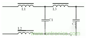 圖5是開關(guān)電源的直流輸出側(cè)濾波電路,它由共模扼流圈L1、L2,扼流圈L3和電容C1、C2組成。為了防止磁芯在較大的磁場強度下飽和而使扼流圈失去作用,磁芯必須采用高頻特性好且飽和磁場強度大的恒μ磁芯。