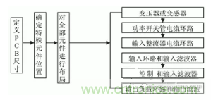 敏感線路主要是指控制電路和直接與干擾測量設(shè)備相連的線路。要降低干擾水平,最簡單的方法就是增大干擾源與敏感線路的間距。但由于受電源尺寸的限制,單純的增大間距并非解決問題的最佳途徑,更為合理的方法是根據(jù)干擾電場的分布情況將敏感線路放在干擾較弱的地方。PCB抗干擾布局設(shè)計流程如圖6所示。