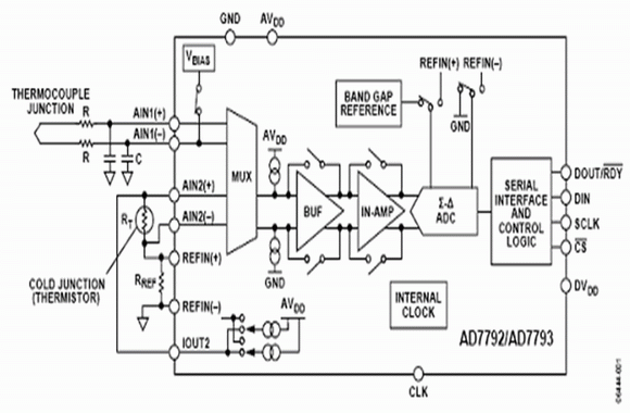 圖1給出利用3通道、16/24位AD7792/AD7793Σ-Δ模數(shù)轉(zhuǎn)換器(也可以使用6通道AD7794/AD7795)的熱電偶系統(tǒng)。其片內(nèi)儀表放大器首先對(duì)熱電偶電壓進(jìn)行放大,然后通過模數(shù)轉(zhuǎn)換器對(duì)放大的電壓信號(hào)進(jìn)行模數(shù)轉(zhuǎn)換。熱電偶產(chǎn)生的電壓偏置在地電平附近。片內(nèi)激勵(lì)電壓源將其偏置到放大器線性范圍以內(nèi),因此系統(tǒng)能夠利用單電源工作。這種低噪聲、低漂移、片內(nèi)、帶隙基準(zhǔn)電壓源,能夠確保模數(shù)轉(zhuǎn)換的精度,從而保證整個(gè)溫度測(cè)量系統(tǒng)的精度。