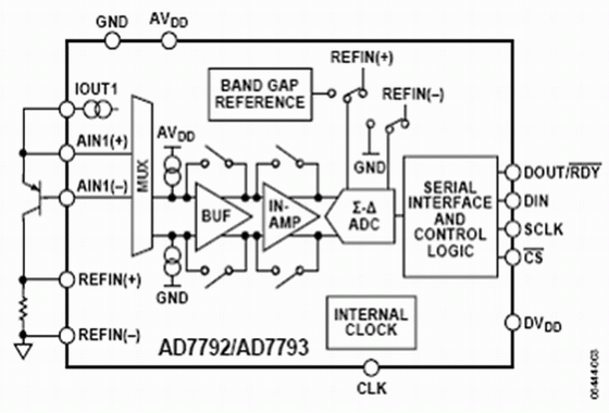 儀表放大器允許開發(fā)低噪聲、低溫漂的增益級(jí)電路。低噪聲與低溫漂非常關(guān)鍵,可以保證因溫度變化引起的電壓變化大于儀表放大器的噪聲電壓。AD7793的增益可以設(shè)置為1, 2, 4, 8, 16, 32, 64,或128。利用128倍的最大增益設(shè)置以及產(chǎn)生的基準(zhǔn)電壓源,AD7793的滿度范圍是±1.17 mV/128 mV或者大約±10 mV。這樣,ADC的高分辨率特點(diǎn)保證無(wú)需任何外部放大器元件就可以達(dá)到最佳效果。